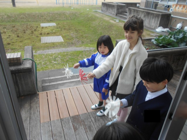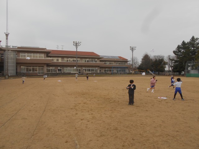 今日の生活科は、前回の続きで、風を利用していろいろな遊びをしました。凧あげをやってみると、子供たちはコツをつかんだようで、前回よりさらに上手に揚げていました。また、風車を作り、回して楽しく遊びました。