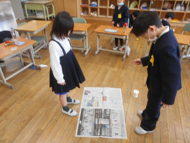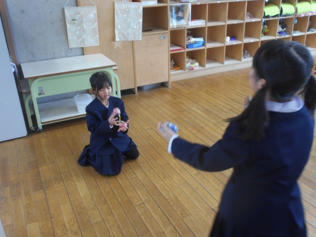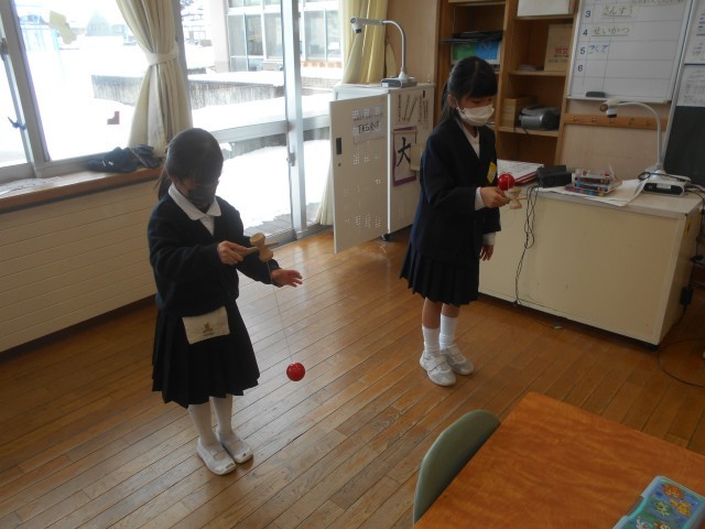 子供たちに「昔の遊びって、どんなものがあるかな?」と質問すると、「凧です!」「羽子板かな?」「けん玉だと思う!」といろいろな答えが返ってきました。そこで今日は、けん玉やお手玉、ビー玉等を使ってみんなで遊びました。「お手玉が難しい!」と言っていた子供も、少しずつできるようになり、うれしそうな姿が見られました。昔の遊びを楽しめたようです。