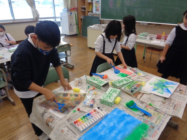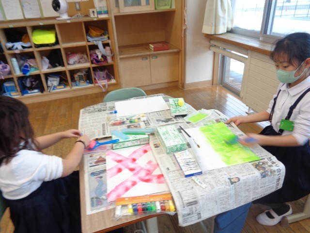 貼ってはがすことのできるシールを好きな形に切り、紙に貼った後でローラーで色を塗りました。作ったもののイメージに合わせて、工夫して色を塗っていました。シールをはがして自分の好きなものの形が現れたときには、「すごい」「やったあ」と歓声を上げていました。