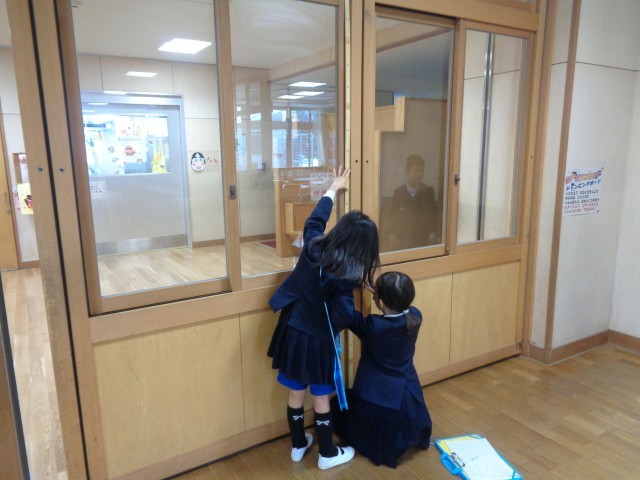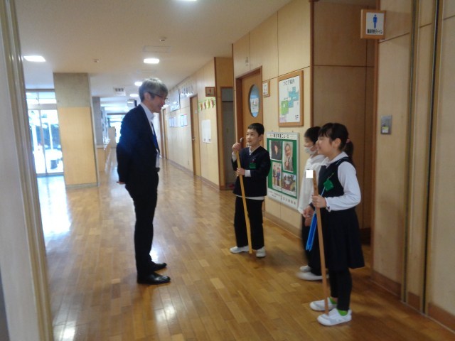 廊下のものを調べていた子供たちは、校長先生から「私の身長はどれだけでしょう?」と問題を出されました。1メートル物差しと見比べながら「160センチメートルくらいかな?」「2メートルくらいじゃない?」と予想していました。