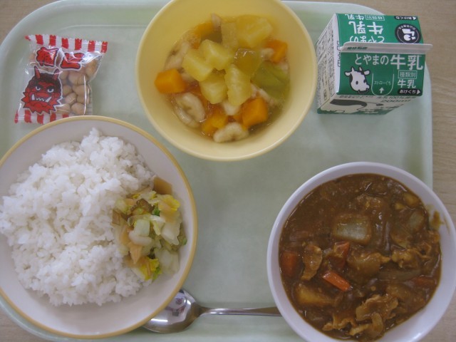 今日の献立は、ごはん 牛乳 カレーライス 福神和え フルーツゼリーミックス 節分豆 です。