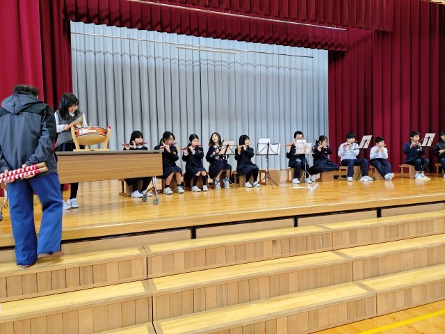 外部講師を招いて2学期から続けてきた、横笛と太鼓のお囃子練習。子供たちは、伝統的な音色を奏でることができるようになってきています。4年生はせいいっぱいの演奏で、創校を祝う気持ちを発表します。