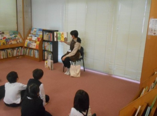 今日は、図書館に行き、読み聞かせや図書紹介をしていただきました。児童全員が楽しそうにお話を聞いていました。