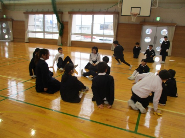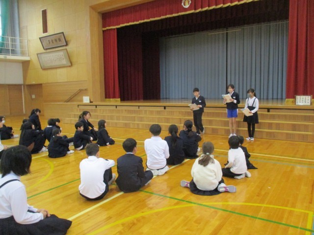 6年生の卒業を祝う交流会がスタートしました。今日は1年生と6年生の交流会で、ハンカチ落としをしました。5年生は交流会がうまくいくか、1年生と6年生が楽しんでくれるかどきどきしながら司会進行、サポートを頑張りました。1年生や6年生が笑顔になっている姿を見て、ほっとする5年生でした。