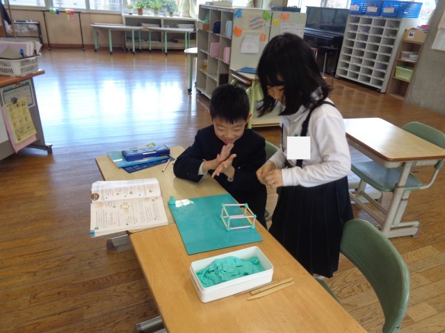 算数科「はこのかたちをしらべよう」の学習で、粘土とストローを使って箱の形をつくりました。