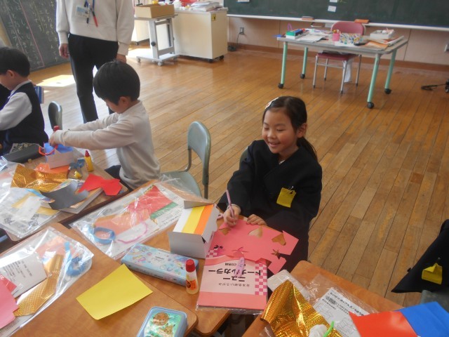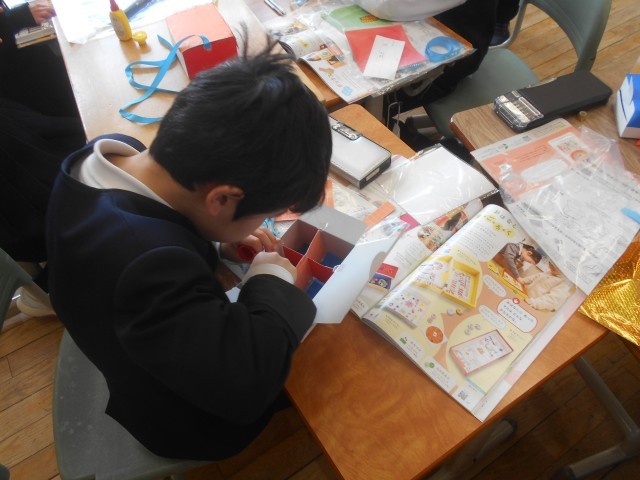 図画工作科では、「たいせつボックス」をつくっています。「切る」「貼る」「塗る」等、学習したことを生かして、すてきなボックスに仕上げています。