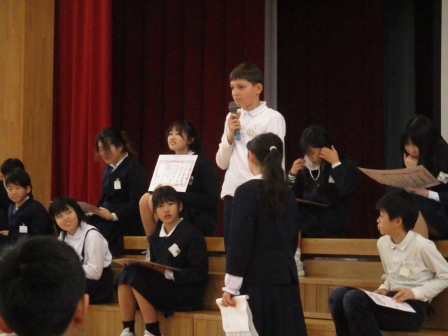 今日は卒業お祝い集会でした。テレビ番組風の進行で楽しい雰囲気の集会となりました。それぞれの学年にお願いしていた出し物もとっても素敵で、5年生の子供たちは感謝の気持ちでいっぱいでした。また、5年生の出し物では、「岩瀬っ子の主張」と題して、6年生への感謝の気持ちを主張したい人を募集し、主張してもらいました。みんな大きい声で主張してくれました。5年生からの主張の後には6年生へのエールとファミリー班で書いたメッセージを渡しました。