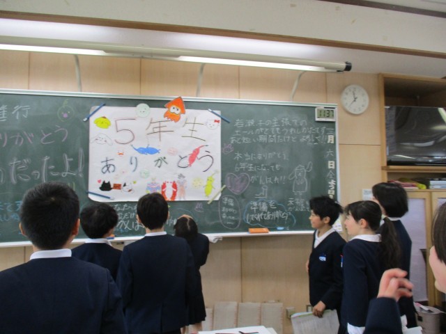2学期末から準備をしてきた卒業お祝いプロジェクトは今日で終わりです。子供たちが自分のなりたい姿や6年生への気持ち、どうしたら喜んでくれるのかを考えぬいて準備をしてきました。そして全校へ様々な協力をお願いし、感謝の気持ちをもつことができた5年生は、たくさんの力をつけてくれたことと思います。今後の5年生にも期待しています!