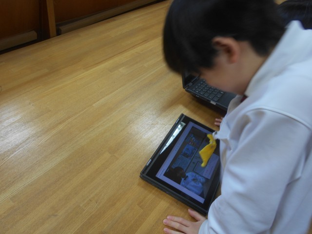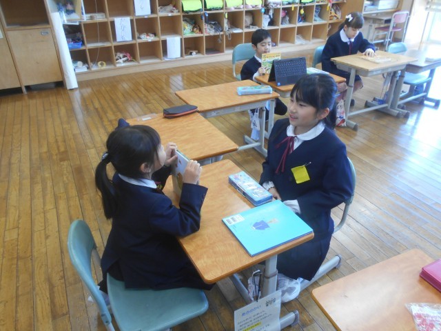 自分が借りた本を友達に紹介するため、話す練習をしています。友達に聞いてもらったり、タブレットで自分が話している場面を録画して見直したり、それぞれ練習に取り組みました。