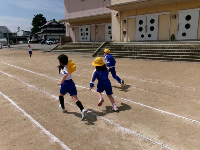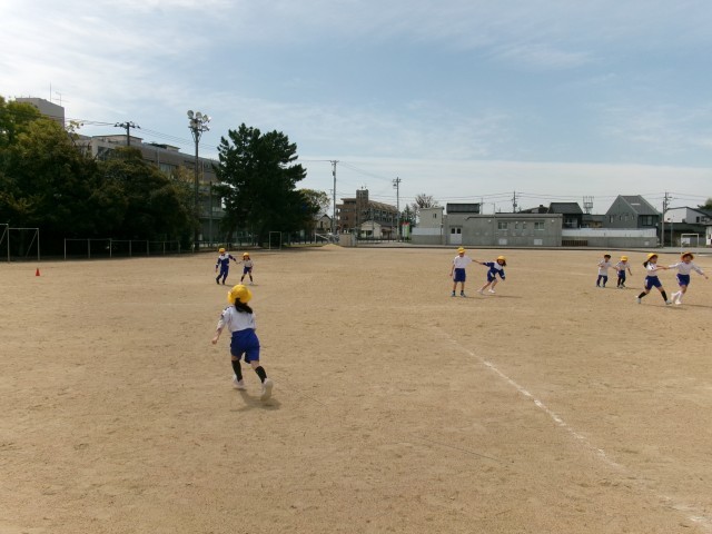 晴れた今日はグラウンドでおにごっこや50m走で思い切り体を動かしました。子供たちは楽しそうに運動していました。