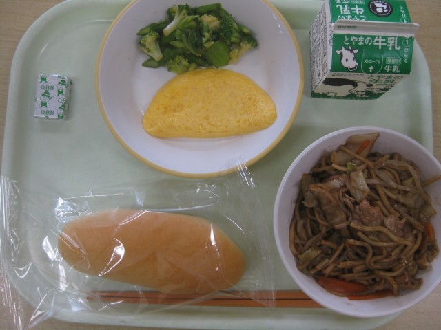 今日の献立は、コッペパン(減) 牛乳 オムレツ グリーンサラダ 焼きそば ポケットチーズ です。