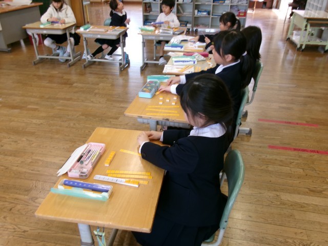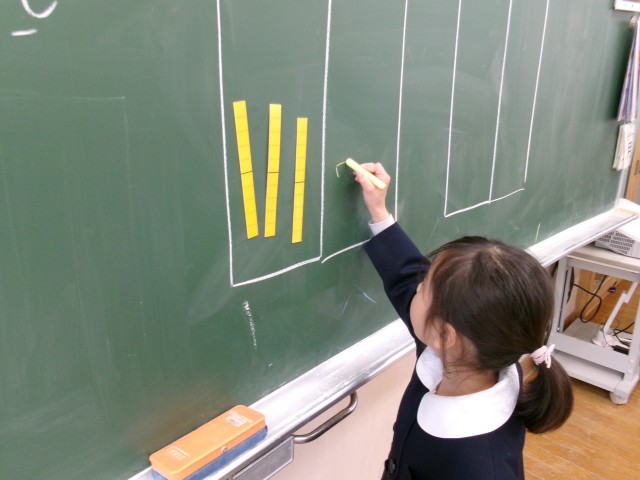 算数科では、新しい学習に入っています。今日は、2けたの足し算を「10のまとまり」と「ばら」に分けて計算しました。