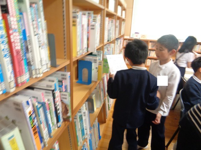 本のシールに書かれている数字やかたかなの意味を教えてもらったり、本を探すクイズに挑戦したりしました。