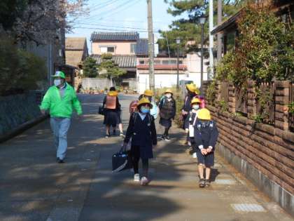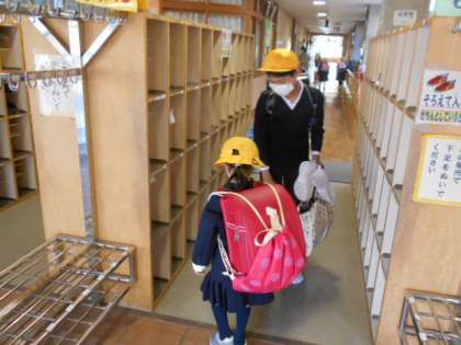入学2日目、町内の大人の方が一緒に付き添ってくださったり、上級生に手をひいてもらったりして、1年生が登校してきました。玄関では、6年生が優しくズックの置き方を教える姿も見られました。