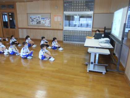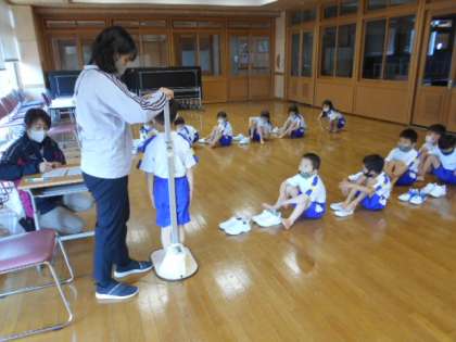 1年生が、初めての身体測定を行いました。くつ下やズックを脱ぎ、そろえて、体操服で身長や体重を測りました。小学校でどれだけ大きく成長するか楽しみですね。さすが2年生は、保健の話(怪我や体調が悪い場合にどうするか)を静かに聞いていました。
