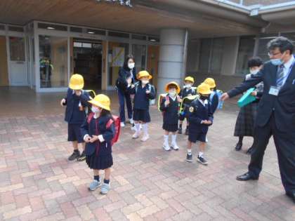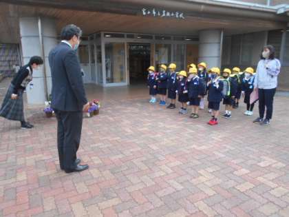 今日、1年生は給食がなく、11時30分に下校です。方向別に教職員が付き添って帰りました。「今日、学校は楽しかったかな。明日からも、自分たちで安全に登下校しましょうね」
