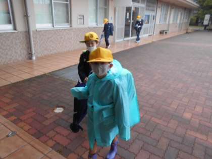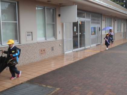 昨日の強風はなくなりましたが、入学してから初めての雨の朝。1年生が、雨ガッパを着て登校してきました。自分で脱いだりカッパかけにかけたり、たたんだりできるかな。