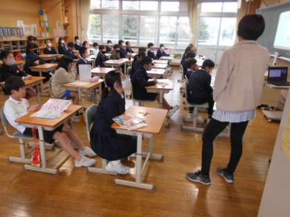 今年度、アメリカ人のALT、日本人の外国語支援講師、担任による3人体制になり、より楽しく、豊富に外国語に慣れ親しむことができると期待します。アメリカの有名な所や食べ物、趣味などを聞き、遠い外国に思いをはせる5年生。「アメリカではワニを食べて、おいしいんだって!」