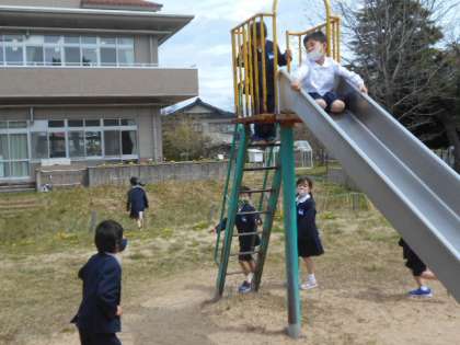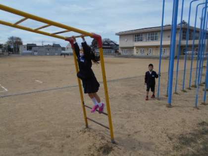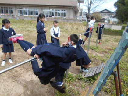 2限目後の大休憩、グラウンドでは、1年生から5年生まで、遊具、鉄棒などで遊んでます。「じゅんばんをまもって、なかよく、あんぜんに、あそぼうね」