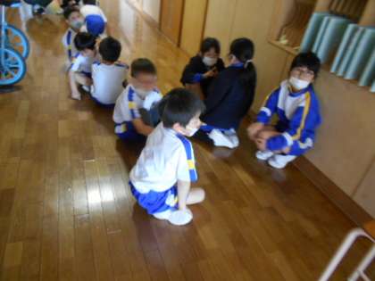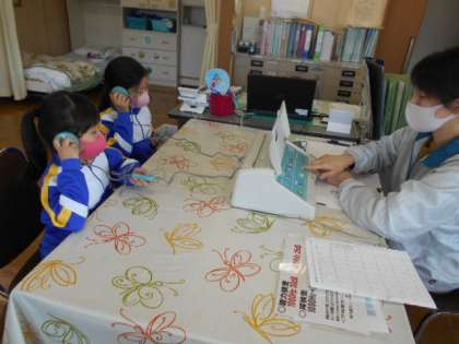 今日は1〜3年生が、聴力検査を行っています。小さい「ピー」という音が聴こえるか確かめるために、廊下で待っている子供も静かに待機する2年生。