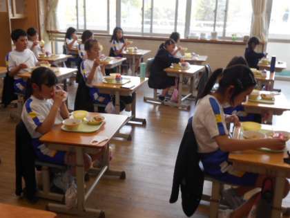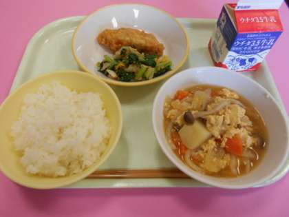 「ごはん、揚げ魚のレモン味、入り大豆あえ、油麩(ふ)の卵とじ」でした。