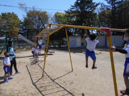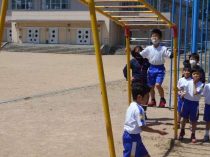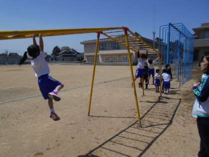 1年生が体育で、うんていにぶら下がって進む競争をしました。力強く早く進む子や、落ちてもしっかりと足から下りる子など、友達と遊びながら安全な動きを身に付けています。