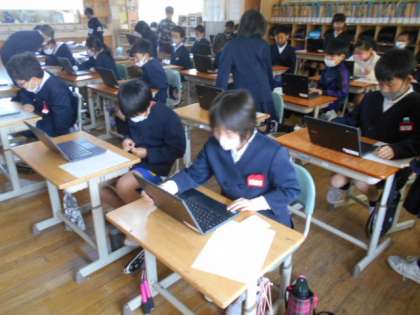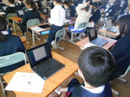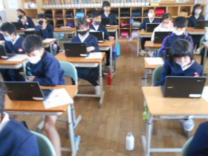 4月27日(火)5年生 タブレット授業始まる 公開日 2021/04/27 更新日 2021/04/27 5年生 5年生が、一人1台配備された新しいタブレットパソコンを使いました。使い方の約束を確認した後、各自のパスワードでログインし、簡単なメッセージを作成・送信しました。「みんなにメッセージを送り、見ることができたよ」動画→5年タブレット1、5年タブレット2