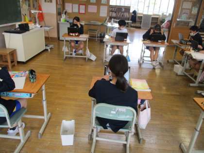 社会科では、日本国憲法の三つの原則と、日常の暮らしのつながりについて、タブレットを使って調べています。学校では初めて触るので、子供たちから「すごい」「きれい」「汚したくない」など興奮している様子でした。