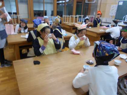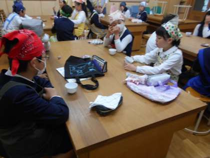 5年生から家庭科が始まります。初めての実習で、家庭科室の器具の置き場所やこんろの使い方を知り、お湯をわかしました。きゅうすで日本茶を入れて「自分たちで入れたお茶はおいしい」「片付けもしないとね」などと言いながら、みんなで飲む動画→5年家庭科