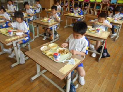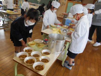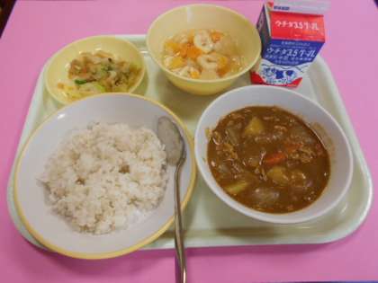 今日の献立は「カレーライス(麦ごはん)、福神あえ、フルーツポンチ」。1年生も入学して初めての給食カレーをもりもり食べていました。