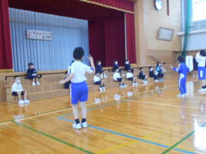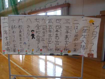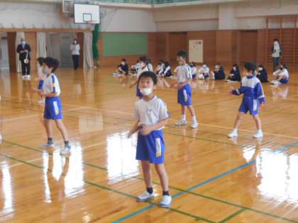 やや遅くなりましたが、「入学おめでとう集会」を行いました。体育館に1年生が入場し、ステージ前のひな段に座り、各学年が交代で発表や出し物、プレゼントなどをおくりました。まずは3年生が、昨年度練習したダンスを見せました。ミニ動画→集会1