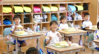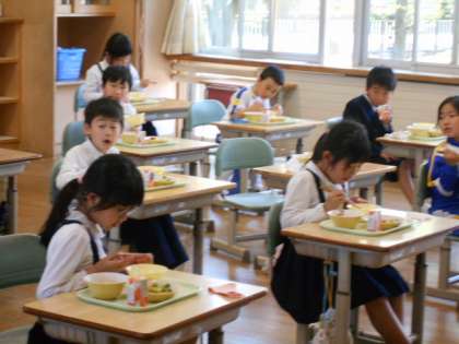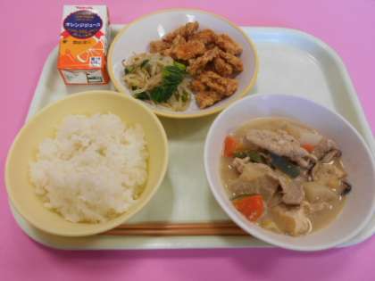 「ごはん、いかのかりん揚げ、豚肉と大根のごま味噌煮、もやしのおひたし、オレンジジュース」でした。