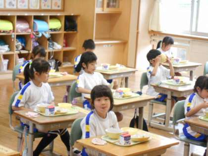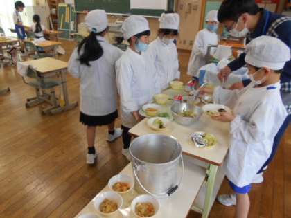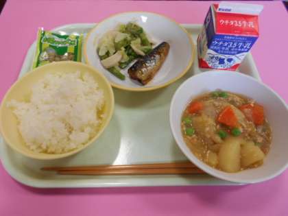 「ごはん、いわしのしょうが味、じゃがいものそぼろ煮、野菜ソテー、抹茶だいず」でした。