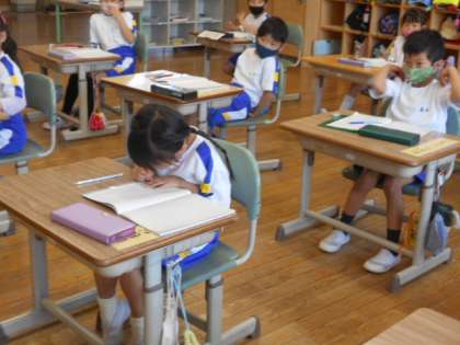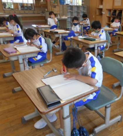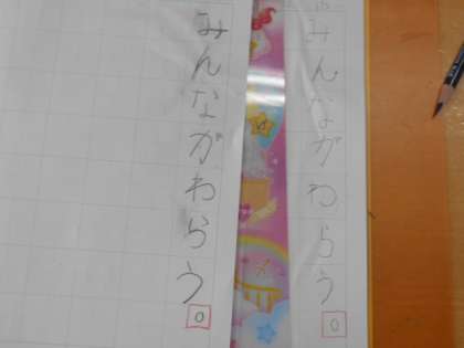 1年生が国語科で、ノートのマスの中に「みんながわらう。」というような文を書いています。ひらがなや書く場所をまちがえずに書いたり、文のさいごに○をつけたりできたかな。