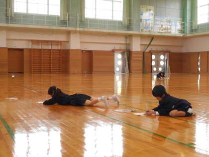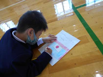 「すてえじのところに じがあるね」と学校の紋章を見つけていました。