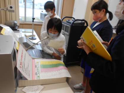 「今日の献立は、ごはん、ビビンバ(焼き肉、ナムル、きんし卵)、味噌汁、冷凍ラフランスでした。」と紹介する放送委員会児童。
