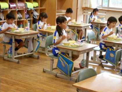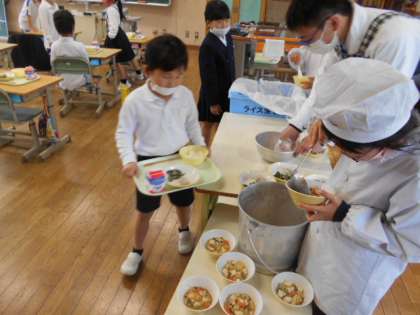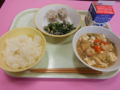 「ごはん、えびと豆腐のうま煮、チンズワンズ(もち米シューマイ)、よごし」でした。