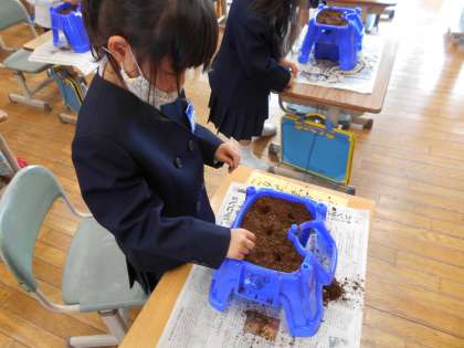 あさがおの種まきを行いました。「まってるよ」「あおいろのはなをさかせてね」などと声をかけて、種を5つ植えました。おうちで用意していただいたペットボトルをじょうろにして、たっぷり水をあげました。