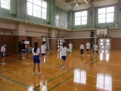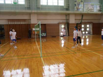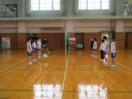 体育科では、ソフトバレーボールの練習試合に取り組みました。チームの和を深めるために、試合中に仲間にどんな声をかけたら良いか考えてプレーすることを大切にしています。