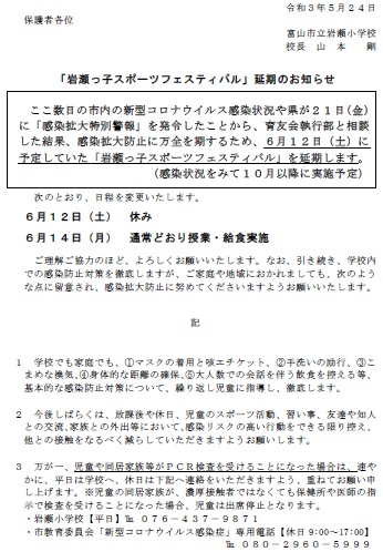 ここ数日の市内の新型コロナウイルス感染状況や県が21日(金)に「感染拡大特別警報」を発令したことから、育友会執行部と相談した結果、感染拡大防止に万全を期するため、6月12日(土)に予定していた「岩瀬っ子スポーツフェスティバル」を、10月以降に延期します。★6月12日(土)は休み。14日(月)は通常どおり授業・給食実施。ご理解ご協力の程よろしくお願いいたします。詳しくは、本日配付のお知らせをご覧ください。→岩瀬っ子スポーツフェスティバル延期のお知らせ