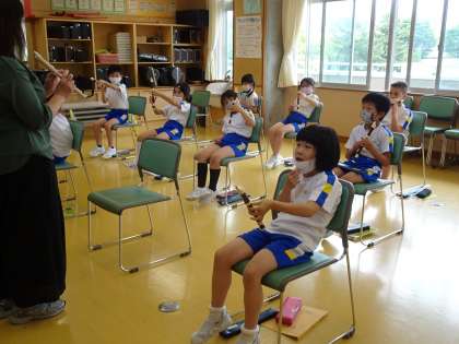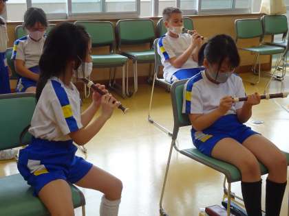 音楽の時間、初めてリコーダーの使い方を学習しました。