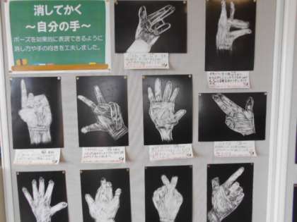 5年生が図画工作科で、自分の手を描きました。黒色を消して白を上手に使いながら、いろいろな手のポーズを仕上げました。