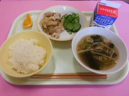 「ごはん、豚肉のしょうが焼き、きゅうりもみ、わかめスープ、バレンシアオレンジ」でした。