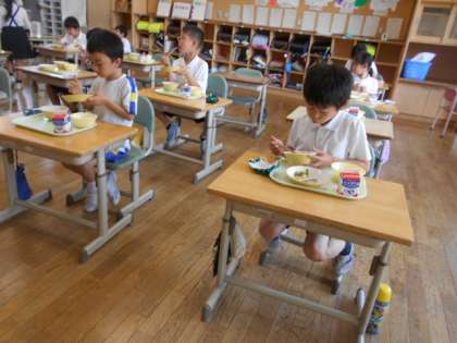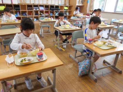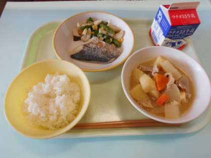 「ごはん、さわらの塩焼き、アスパラソテー、じゃがいもと豚肉の味噌煮込み」でした。「みんなと食べるとおいしいね」