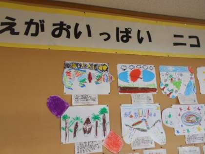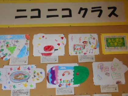 (画像は、2年生の学級目標と図画工作科「ふしぎなたまご」の作品)