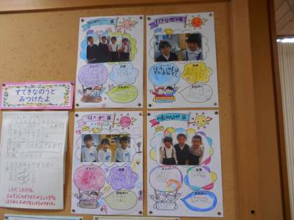 「たのしいあそびがかり」「くいずがかり」「おたんじょうびがかり」「すてきなかざりかかり」の4つの係を作りました。1年松組がもっと楽しくなるために、考えています。