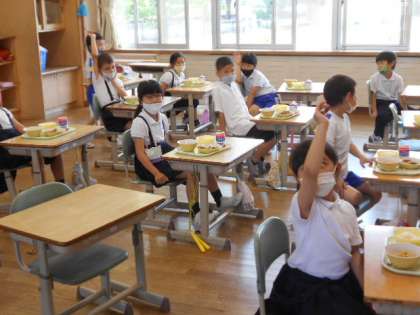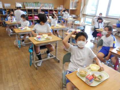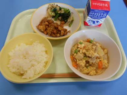 「ごはん、大豆とホタテのごまがらめ、こんぶあえ、卵とじ」でした。お代わりや少し減らしてほしいと願う2・3年生。