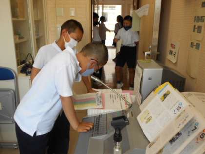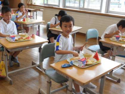 金曜当番の校内放送を聞きながら、給食を食べる2年生。