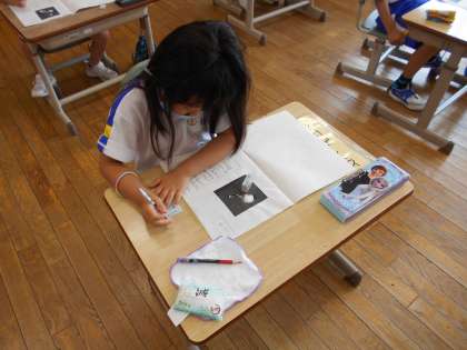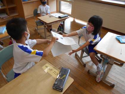 国語科「くちばし」では、4つ目のくちばしとして、自分のお気に入りの鳥のくちばしを紹介する文を書きました。隣の席の友達に、自分の書いた本を見せています。「くちばしのかたちがおもしろいね」「ていねいにじがかけてるね」など、付箋に友達へのメッセージを書きました。付箋を貰った子供たちは「うれしいな」と大切そうにメッセージを見ていました。