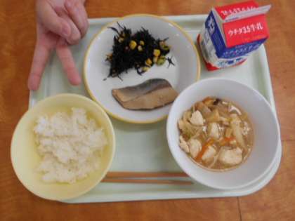 「ごはん、ふくらぎの西京焼き、ひじきのソテー、豆腐の野菜あんかけ」でした。1年生も、自分たちで配膳をしています。